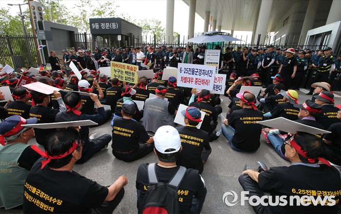 (세종=포커스뉴스) 16일 오후 세종시 정부세종청사 국가보훈처 앞에서 6.25 전몰군경미수당비대위 구성원들이 예산확보를 요구하는 집회를 하고 있다.