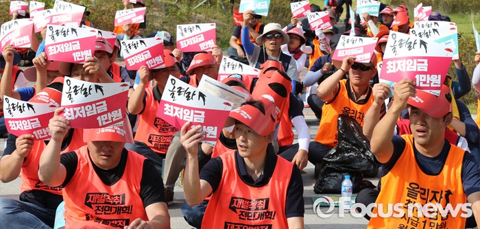 (세종=포커스뉴스) 민주노총 세종충남본부 조합원들이 16일 오후 정부세종청사 고용노동부 앞에서 최저임금 1만원 쟁취 집회를 갖고 있다. 이날 최저임금위원회 4차 전체회의가 열렸다.