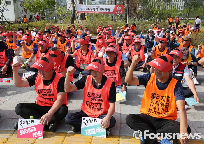 (세종=포커스뉴스) 민주노총 세종충남본부 조합원들이 16일 오후 정부세종청사 고용노동부 앞에서 최저임금 1만원 쟁취 집회를 갖고 있다. 이날 최저임금위원회 4차 전체회의가 열렸다.