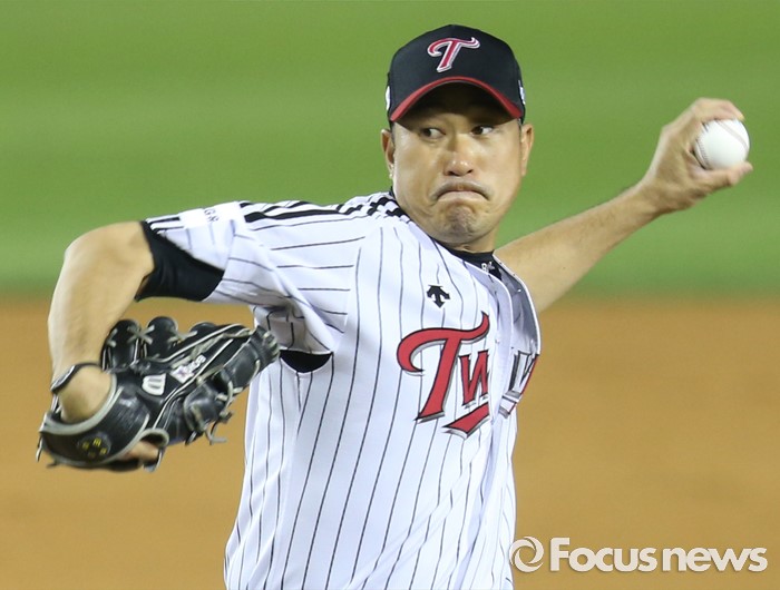 (서울=포커스뉴스) 16일 서울 잠실구장에서 열린 2016 프로야구 NC-LG 경기 7회초 2사 1,2루에서 구원 등판한 LG 봉중근이 힘차게 투구하고 있다.