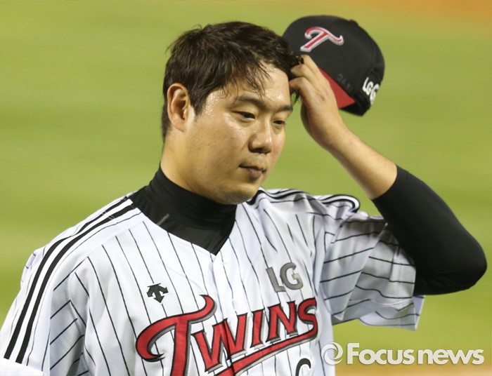 (서울=포커스뉴스) 16일 서울 잠실구장에서 열린 2016 프로야구 NC-LG 경기 7회초 2사 1,2루에서 LG 투수 류제국이 교체돼 마운드를 내려 가며 이마의 땀을 닦고 있다.