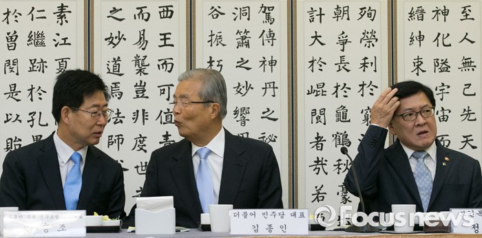 (서울=포커스뉴스) 17일 오전 서울 여의도 국회 귀빈식당에서 열린 국회 저출산극복 연구포럼 1차 회의에 참석한 김종인(가운데) 더불어민주당 비대위 대표와 포럼 공동대표인 양승조(왼쪽) 의원이 대화하고 있다. 오른쪽은 정진엽 보건복지부 장관.