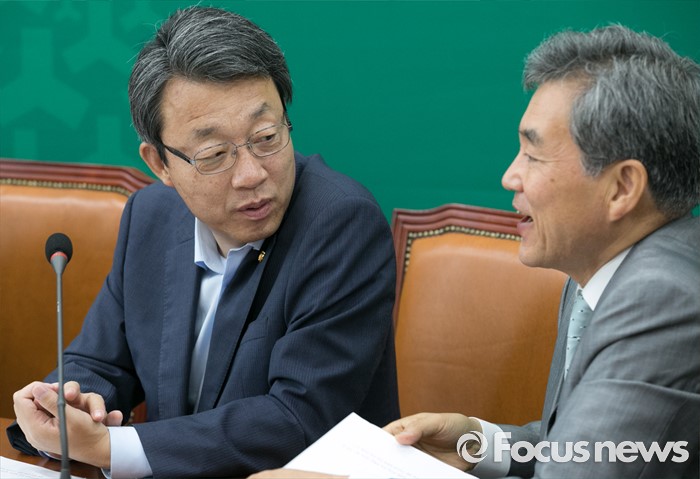 (서울=포커스뉴스) 17일 오전 서울 여의도 국회에서 열린 국민의당 최고위원회의에 참석한 김성식(왼쪽) 정책위의장과 김수민 의원 리베이트 의혹 진상조사단장인 이상돈 최고위원이 대화하고 있다.