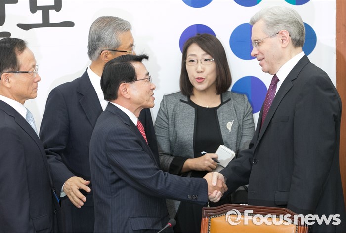 (서울=포커스뉴스) 심재권(왼쪽) 국회 외교통일위워장이 17일 오전 서울 여의도 국회를 방문한 알렉산드로 티모닌 주한러시아대사와 면담에 앞서 인사하고 있다.