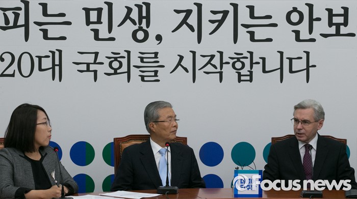 (서울=포커스뉴스) 김종인(가운데) 더불어민주당 비대위 대표가 17일 오전 서울 여의도 국회를 방문한 알렉산드로 티모닌(오른쪽) 주한러시아대사와 면담을 하고 있다.