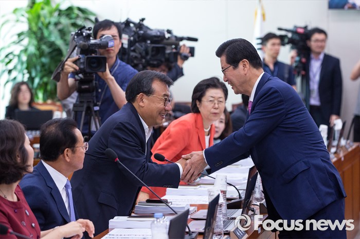 (서울=포커스뉴스) 강길부(오른쪽) 교육문화체육관광위원회 위원과 이정현 위원이 17일 오전 서울 여의도 국회에서 열린 '교육문화체육관광위원회 전체회의'에 참석해 악수 하고 있다.