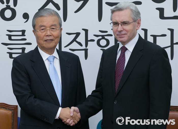 (서울=포커스뉴스) 김종인(왼쪽) 더불어민주당 비대위 대표가 17일 오전 서울 여의도 국회를 방문한 알렉산드로 티모닌 주한러시아대사와 면담에 앞서 인사하고 있다.