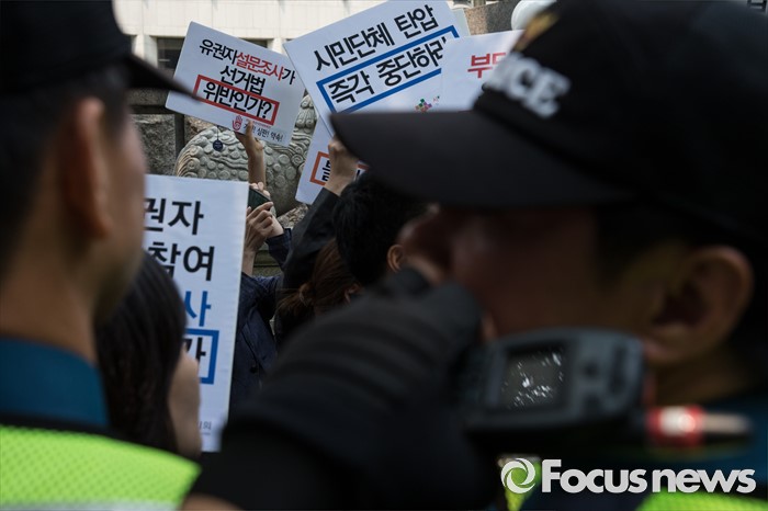(서울=포커스뉴스) 17일 오후 서울 종로구 서울지방경찰청 앞에서 총선네트워크(총선넷) 회원들이 경찰 과잉수사 및 압수수색 규탄 기자회견을 하고 있다.