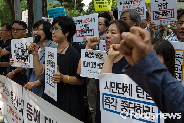 (서울=포커스뉴스) 17일 오후 서울 종로구 서울지방경찰청 앞에서 총선네트워크(총선넷) 회원들이 경찰 과잉수사 및 압수수색 규탄 기자회견을 하고 있다.