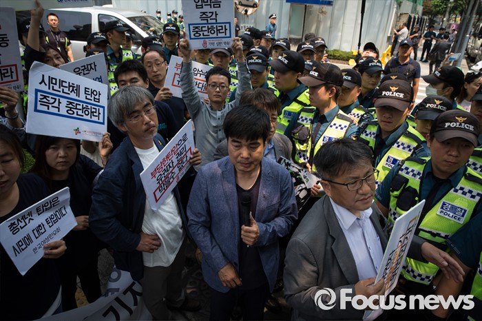(서울=포커스뉴스) 17일 오후 서울 종로구 서울지방경찰청 앞에서 총선네트워크(총선넷) 회원들이 경찰 과잉수사 및 압수수색 규탄 기자회견을 저지하는 경찰들과 대치하고 있다.