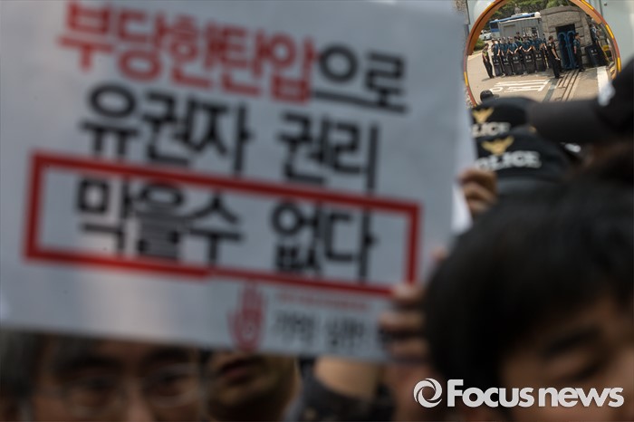 (서울=포커스뉴스) 17일 오후 서울 종로구 서울지방경찰청 앞에서 총선네트워크(총선넷) 회원들이 경찰 과잉수사 및 압수수색 규탄 기자회견을 하고 있다.
