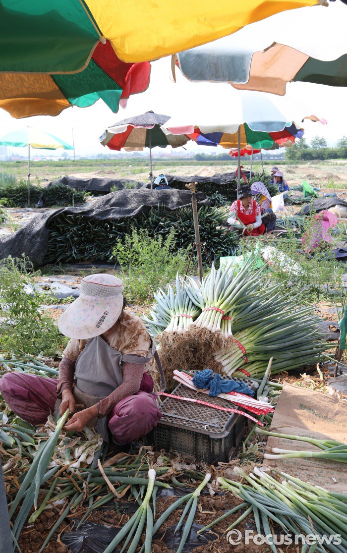 (청주=포커스뉴스) 최고기온이 30도가 넘으며 무더운 날씨를 보인 17일 오후 충북 청주시 흥덕구 들녘에서 농민들이 파를 수확하고 있다.