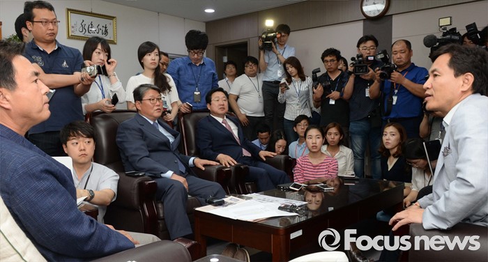 (서울=포커스뉴스) 17일 오후 서울 여의도 국회 의원회관 김태흠 새누리당 의원실에서 조원진, 이장우, 김진태, 김태흠 의원 등 친박계 의원들이 탈당파 복당 문제와 관련 논의를 하고 있다.