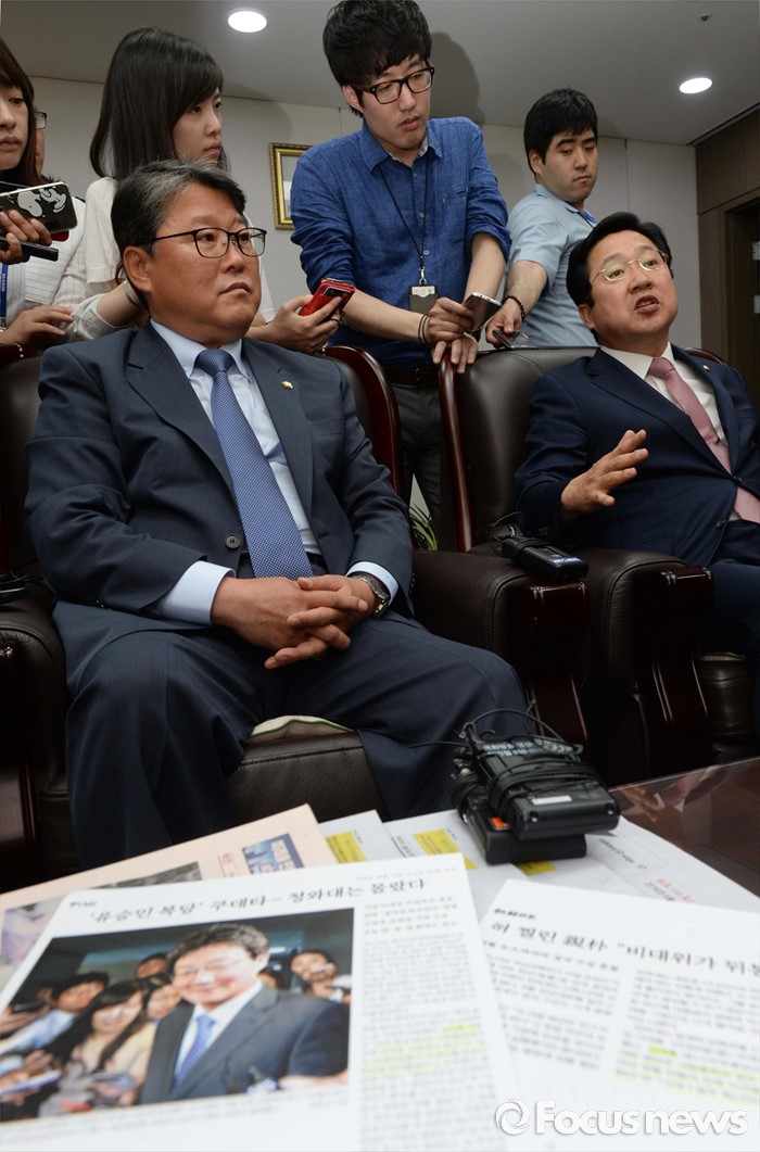 (서울=포커스뉴스) 17일 오후 서울 여의도 국회 의원회관 김태흠 새누리당 의원실에서 조원진(왼쪽), 이장우 의원 등 친박계 의원들이 탈당파 복당 문제와 관련 논의를 하고 있다.