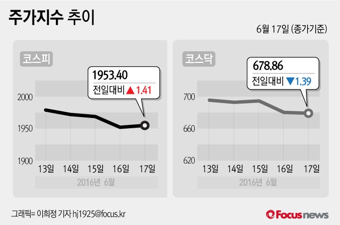서울=포커스뉴스) 17일 코스피지수는 전날 보다 0.07%(1.41포인트) 오른 1953.40에 장을 마쳤다. 코스닥지수는 전일 대비 0.20%(1.39포인트) 내린 678.86에 마감했다.