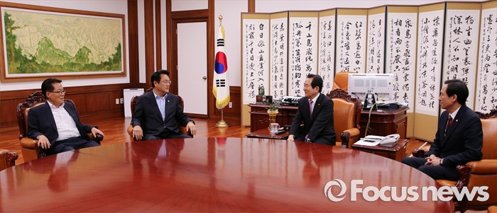 (서울=포커스뉴스) 정세균 국회의장이 17일 오후 서울 여의도 국회 의장집무실에서 3당 원내대표와 현안 논의를 위한 회동을 하고 있다. 왼쪽부터 박지원 국민의당 원내대표, 정진석 새누리당 원내대표, 정 의장, 우상호 더불어민주당 원내대표.
