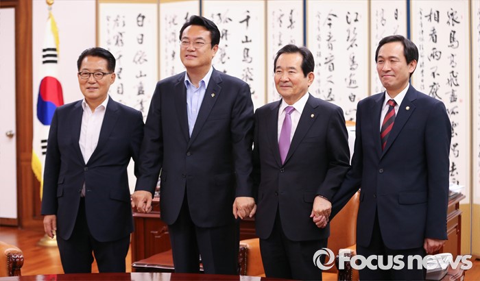 (서울=포커스뉴스) 정세균 국회의장이 17일 오후 서울 여의도 국회 의장집무실에서 3당 원내대표와 현안 논의를 위한 회동에 앞서 취재진을 향해 포즈를 취하고 있다. 왼쪽부터 박지원 국민의당 원내대표, 정진석 새누리당 원내대표, 정 의장, 우상호 더불어민주당 원내대표.