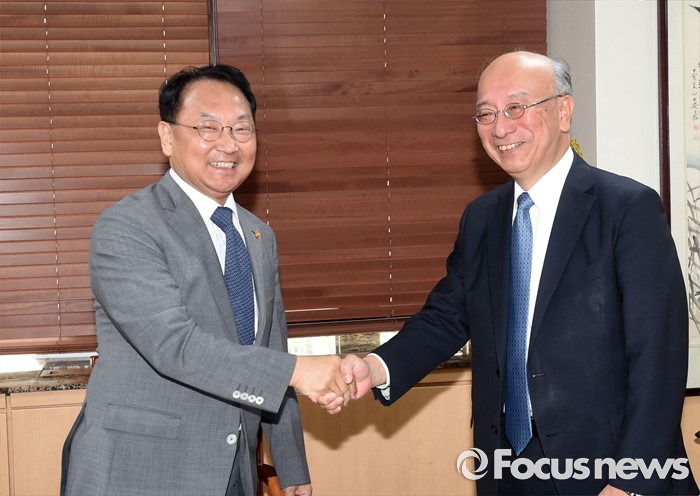 (서울=포커스뉴스) 유일호 부총리 겸 기획재정부 장관이 17일 오후 서울 종로구 서울청사에서 벳쇼 고로 주한 일본대사와 면담에 앞서 악수하며 인사를 나누고 있다. <사진제공=기획재정부>
