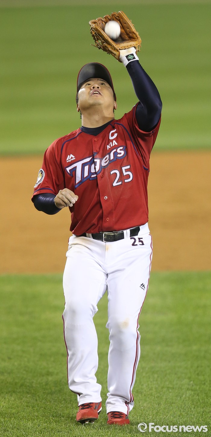 (서울=포커스뉴스) 17일 서울 잠실구장에서 열린 2016 프로야구 KIA-LG 경기에서 9회말 1사 1루에서 KIA 3루수 이범호가 LG 강승호의 내야플라이를 잡고 있다.