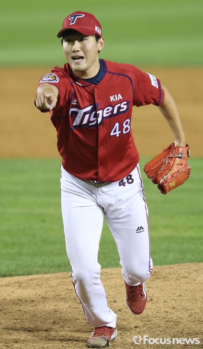 (서울=포커스뉴스) 17일 서울 잠실구장에서 열린 2016 프로야구 KIA-LG 경기에서 9회말 2사 3루에서 구원 등판한 KIA 투수 헝건희가 포수 백용환에게 빠트린 볼의 위치를 가리키고 있다.
