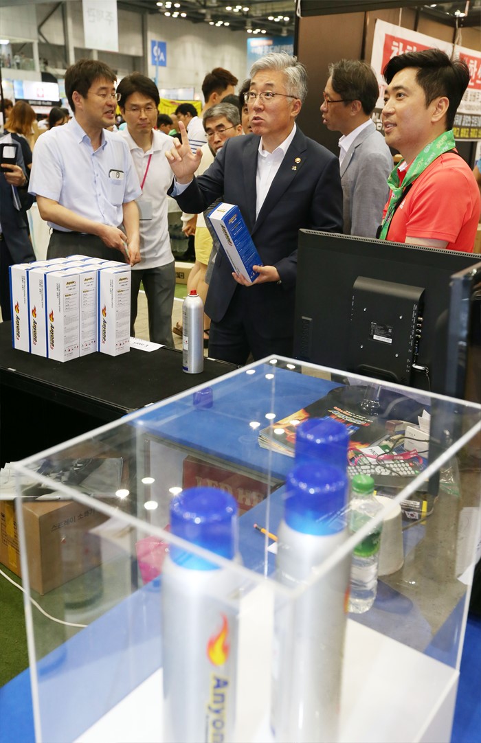| △ 캠핑용품 전시관 둘러보는 김종덕 장관 |