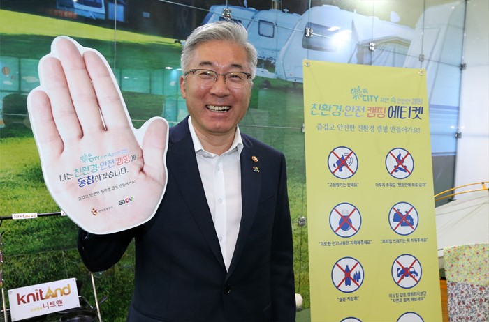(고양=포커스뉴스) 김종덕 문화체육관광부 장관이 18일 경기도 고양시 킨텍스에서 열린 ‘친환경·안전 캠핑축제’를 찾아 제2전시장에 마련된 주제관에서 친환경·안전 캠핑에 동참할 것이라는 내용의 피켓을 손에 들고 기념촬영을 하고 있다. <사진제공=문화체육관광부>
