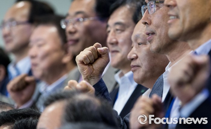(양평=포커스뉴스) 17일 오후 경기 양평 강하면 블룸비스타에서 열린 2016년도 한국선주협회 사장단 연찬회에서 김영석 해양수산부 장관을 비롯한 참석자들이 파이팅을 외치며 기념촬영을 하고 있다.