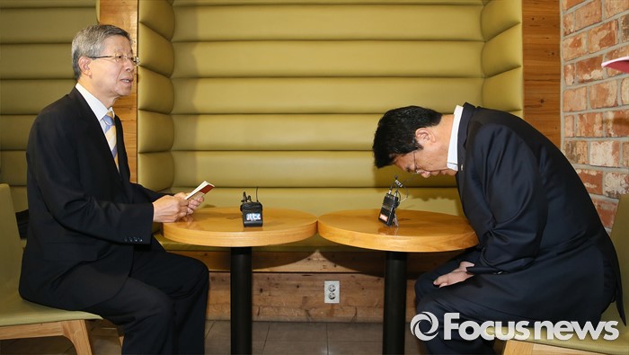 (서울=포커스뉴스) 김희옥 새누리당 혁신비상대책위원장과 정진석 원내대표가 19일 오전 서울 강남구 논현동 한 카페에서 비상대책위원회 정상화를 위한 회동을 하고 있다. 이번 회동은 지난 16일 탈당 무소속 의원들의 일괄복당을 결정한 혁신비대위 회의 과정에 불만을 제기하고 김 위원장이 칩거에 들어간지 나흘째 전격적으로 이뤄진 회동이다.