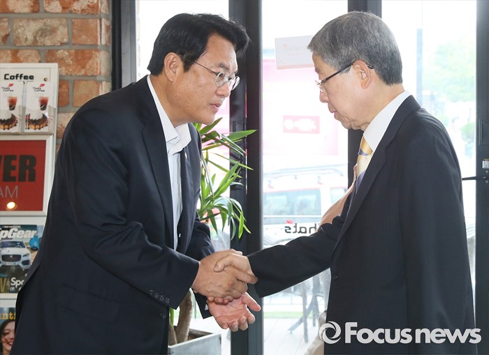 (서울=포커스뉴스) 김희옥 새누리당 혁신비상대책위원장과 정진석 원내대표가 19일 오전 서울 강남구 논현동 한 카페에서 비상대책위원회 정상화를 위한 회동을 하고 있다. 이번 회동은 지난 16일 탈당 무소속 의원들의 일괄복당을 결정한 혁신비대위 회의 과정에 불만을 제기하고 김 위원장이 칩거에 들어간지 나흘째 전격적으로 이뤄진 회동이다.
