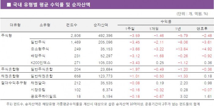 특히 중소형주의 하락률이 상대적으로 크게 나타나면서 중소형주식펀드가 -3.66%의 수익률로 주식형펀드 중 가장 부진했다.