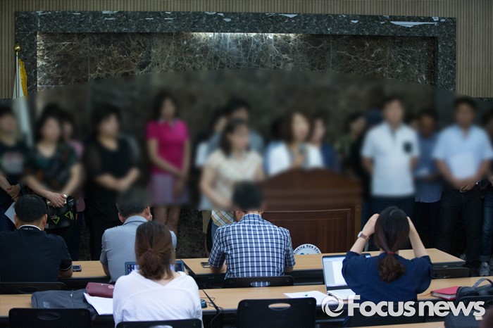 (안산=포커스뉴스) 19일 오전 경기도 안산시 안산교육지원청에서 단원고 재학생 학부모들의 세월호 희생자 존치교실 대안을 촉구하는 기자회견이 열리고 있다. 사진은 학부모들의 요청으로 모자이크 처리 되었다