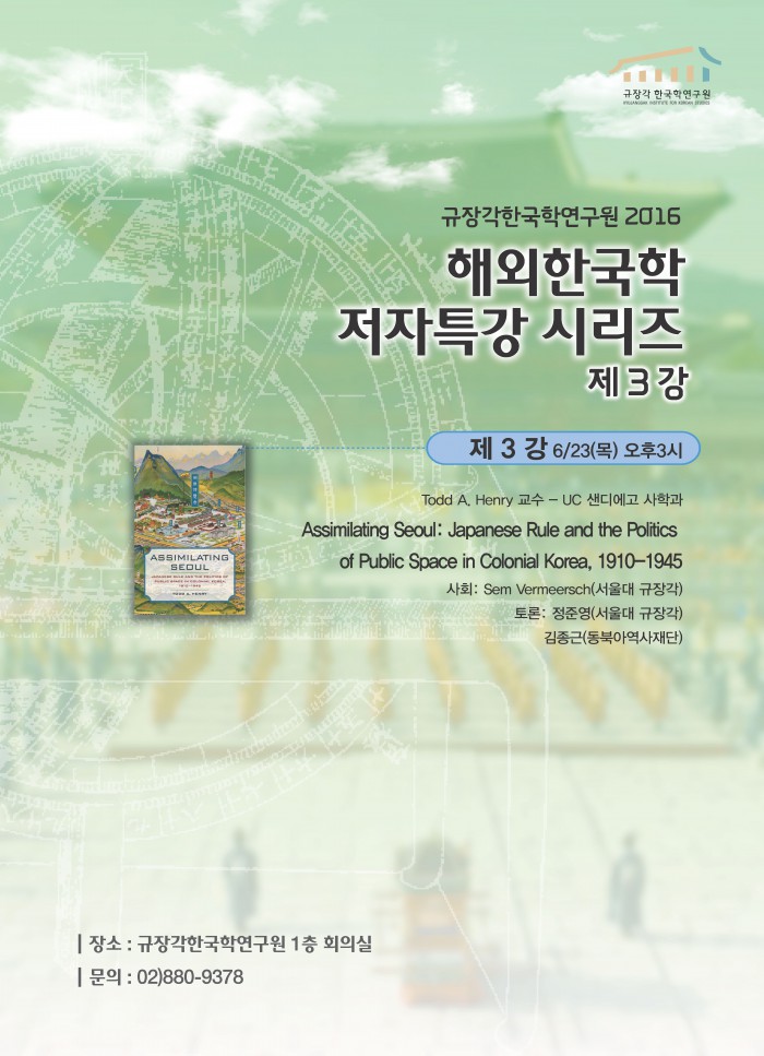 이번 특강은 23일 오후 3시 규장각 한국학연구원 1층 회의실에서 열리며 토드 A. 헨리(Todd A. Henry) 미국 UC샌디에고 교수의 저서 '서울의 이해 : 일제강점기 일본의 통치와 공공정책(Assimilating Seoul : Japanese Rule and the Politics of Public Space in Colonial Korea, 1910-1945)'로 진행된다.