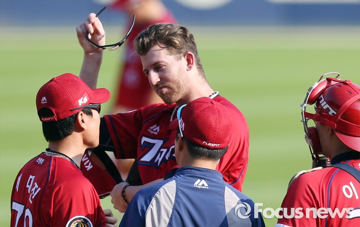 (서울=포커스뉴스) 19일 서울 잠실구장에서 열린 2016 프로야구 KIA-LG 경기 2회말 KIA 이대진 코치가 마운드에 올라가 실점한 지크를 다독이고 있다.