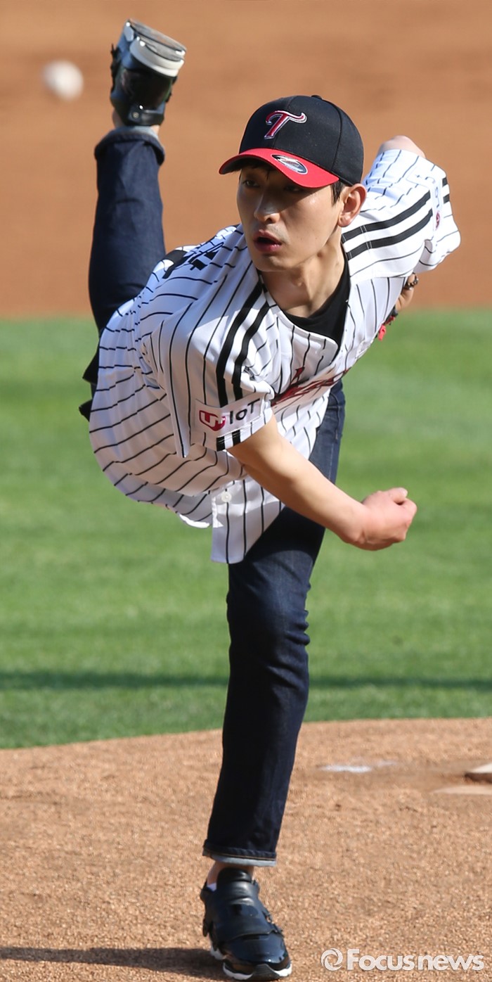 (서울=포커스뉴스) 19일 서울 잠실구장에서 열린 2016 프로야구 KIA-LG 경기에 앞서 배우 윤박이 시구하고 있다.