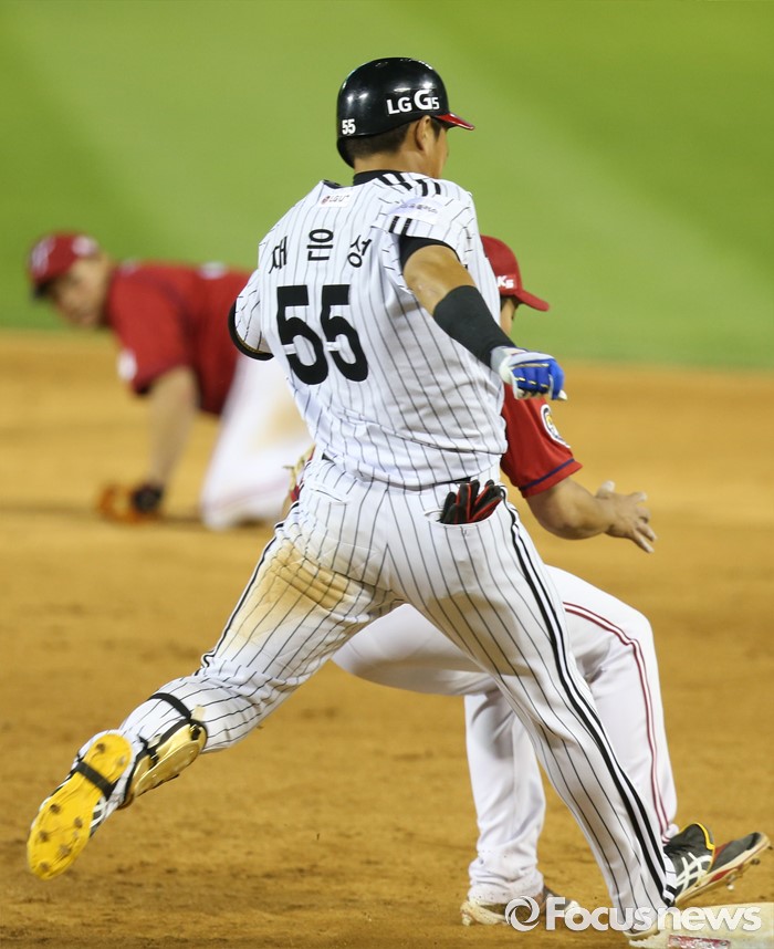 (서울=포커스뉴스) 19일 서울 잠실구장에서 열린 2016 프로야구 KIA-LG 경기 9회말 2사 1루에서 LG 채은성이 1루강습 내야안타를 치고 1루 베이스를 밟고 있다.