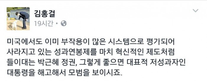 한편, 박 대통령은 지난 14일 공공기관장 워크숍을 주재하며 "성과중심의 임금체계 개편이 꼭 필요하다"며 성과연봉제 도입을 독려했다.김홍걸 전 더불어민주당 국민통합위원장이 19일 자신의 페이스북에 "성과연봉제가 그렇게 좋으면 대표적 저성과자인 대통령을 해고 해서 모범을 보이시죠"라고 쓴소리했다. <사진출처=김홍걸 페이스북 캡처>