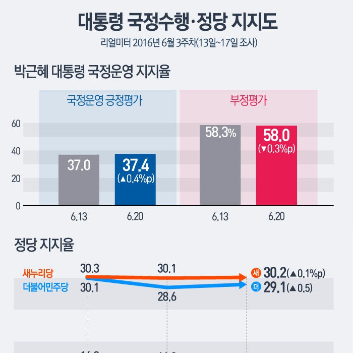 (서울=포커스뉴스) 여론조사 기관 리얼미터의 2016년 6월 3주차 주간집계에 따르면 박근혜 대통령의 국정수행 지지도는 지난 6월 2주차 주간집계 대비 소폭 오른 37.4%였다. 정당 지지도는 지난주와 비슷한 양상을 보였다.