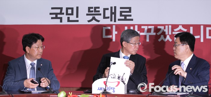 (서울=포커스뉴스) 20일 오전 서울 여의도 새누리당사에서 열린 혁신비상대책위원회의에 참석한 김희옥(가운데) 혁신비대위원장과 김광림(오른쪽) 정책위의장이 대화하고 있다. 왼쪽은 권성동 사무총장.