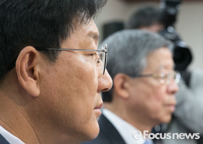 (서울=포커스뉴스) 김희옥(오른쪽) 새누리당 혁신비대위원장으로부터 사퇴 권고를 받은 권성동 사무총장이 20일 오전 서울 여의도 당사에서 열린 혁신비상대책위원회의에 참석해 생각에 잠겨 있다.