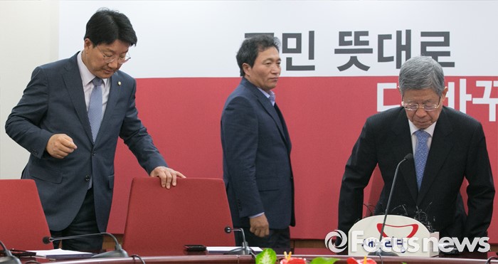 (서울=포커스뉴스) 20일 오전 서울 여의도 새누리당사에서 열린 혁신비상대책위원회의에 참석한 김희옥(오른쪽) 혁신비대위원장과 권성동(왼쪽) 사무총장이 자리에 앉고 있다.