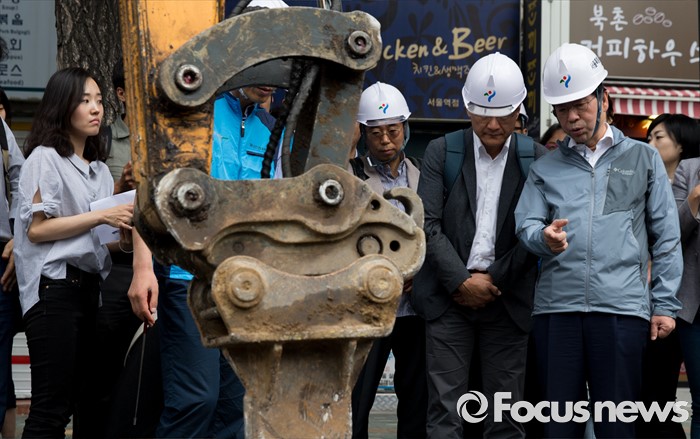 (서울=포커스뉴스) 박원순 서울시장이 20일 오전 서울역 인근 도로에서 동공 굴착 원인조사 및 복구과정을 점검하고 있다.