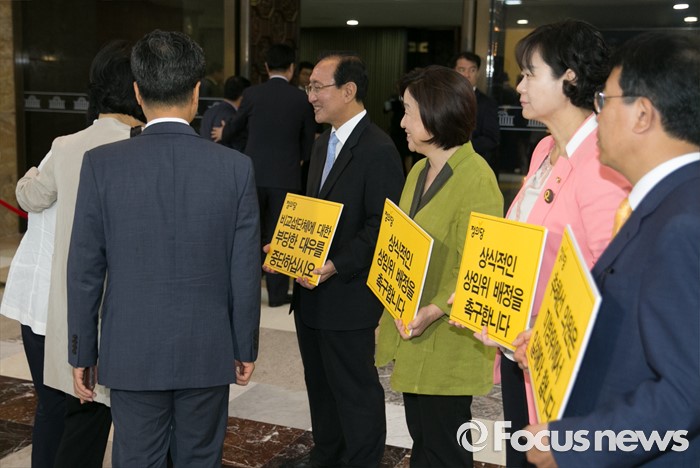 (서울=포커스뉴스) 심상정 정의당 상임대표, 노회찬 원내대표 등 의원들이 20일 오전 서울 여의도 국회에서 열리는 343회 국회(임시회) 3차 본회의에 참석하는 의원들을 향해 추혜선 의원 등의 합당한 상임위 배정을 촉구하는 피켓팅을 하고 있다.
