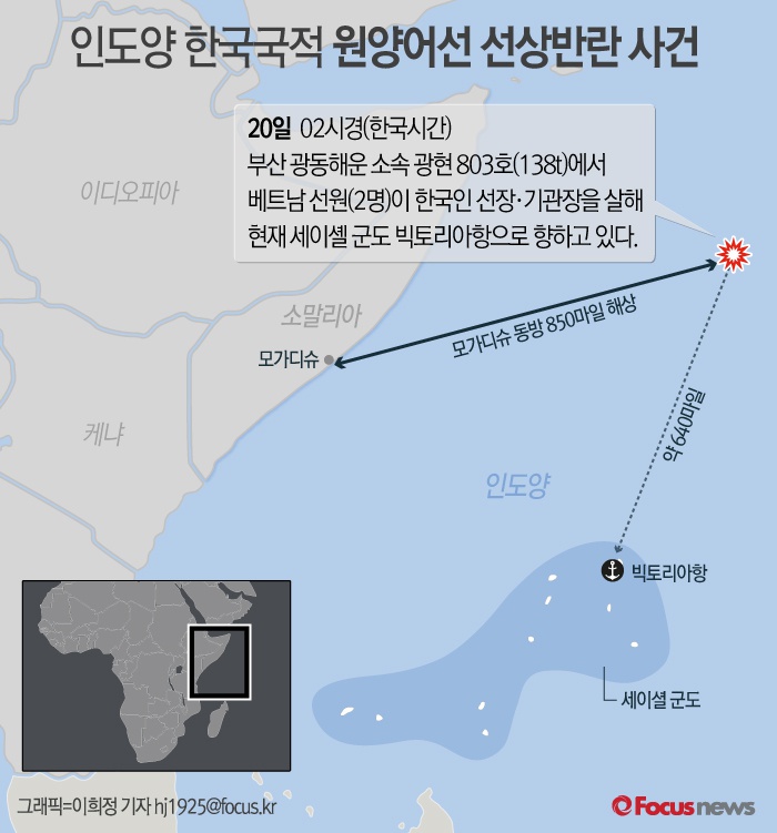 (서울=포커스뉴스) 20일 해양수산부에 따르면 이날 오전 2시경(한국시간) 인도양 세이셀 군도 근처 해상을 운항하던 부산 광동해운 소속 138톤 원양어선(광현 803호)에서 베트남 선원 2명이 음주 후 난동을 부리는 등 한국 선장·기관장 사망사건이 발생했다. 현재 어선은 베트남 선원을 격리한 후 세이셸 빅토리아항 입항차 항해 중으로 3~4일 소요될 예정이다.