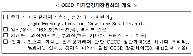 이후 최 장관은 개최국인 멕시코와 캐나다, 프랑스, 뉴질랜드 등 OECD 주요 회원국 장관은 물론 훌린 짜오 ITU 사무총장, 안드루스 안시프 EU 디지털 싱글마켓 위원회 부위원장과의 6차례 면담을 진행한다. 이 자리에서 그는 창의적 혁신으로 디지털경제의 실현을 추구하는 창조경제에 대한 정책경험을 공유하고 상호 협력방안을 논의할 계획이다.OECD 디지털경제장관회의 개요.<표제공=미래부>