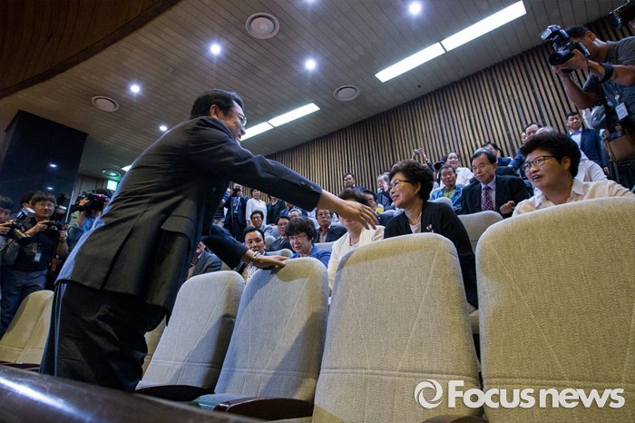 (서울=포커스뉴스) 정진석 새누리당 원내대표가 20일 오전 서울 여의도 국회에서 열린 본회의를 마친 뒤 정 원내대표의 교섭단체 대표연설을 방청하기 위해 본회의장을 찾은 충남 공주시 지역구 주민들과 인사 하고 있다.