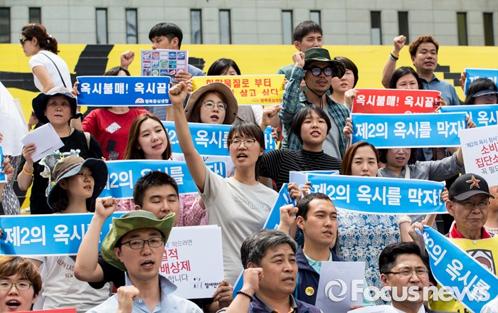 (서울=포커스뉴스) 20일 오후 서울 종로구 세종문화회관 앞 계단에서 환경운동연합과 시민사회단체들이 가습기 살균제 참사 전국네트워크 출범 기자회견을 하고 있다.