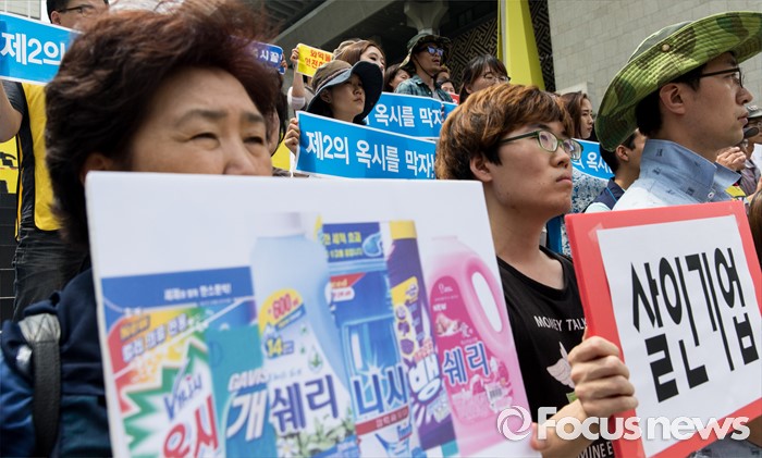 (서울=포커스뉴스) 20일 오후 서울 종로구 세종문화회관 앞 계단에서 환경운동연합과 시민사회단체들이 가습기 살균제 참사 전국네트워크 출범 기자회견을 하고 있다.