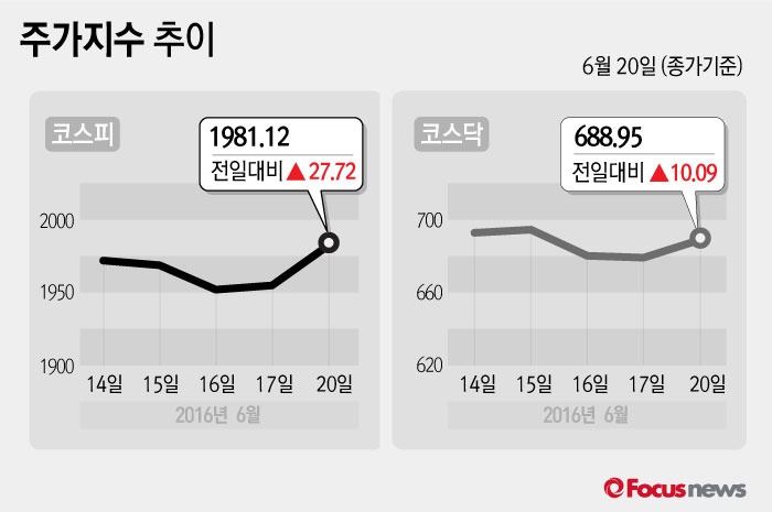 (서울=포커스뉴스) 20일 코스피지수는 전날 보다 1.42%(27.72포인트) 오른 1981.12에 장을 마쳤다. 코스닥지수는 전일 대비 1.49%(10.09포인트) 오른 688.95에 마감했다.