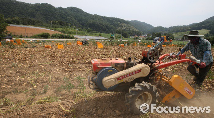 (괴산-포커스뉴스) 장마철을 앞두고 20일 오후 충북 괴산군 들녘에서 농민들이 감자를 수확하고 있다.