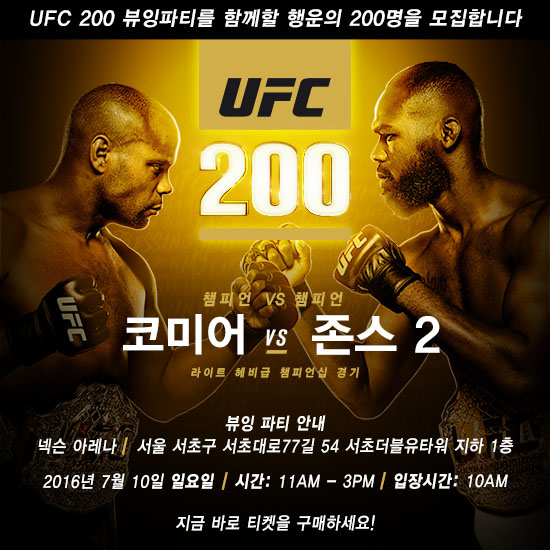 UFC는 공식중계방송사 SPOTV와 함께 다음달 10일 오전 11시부터 오후 3시까지 서울 서초구 넥슨아레나에서 선보이는 'UFC 200: 코미어 vs 존 존스 2 뷰잉 파티'에서 팬들과 함께한다.